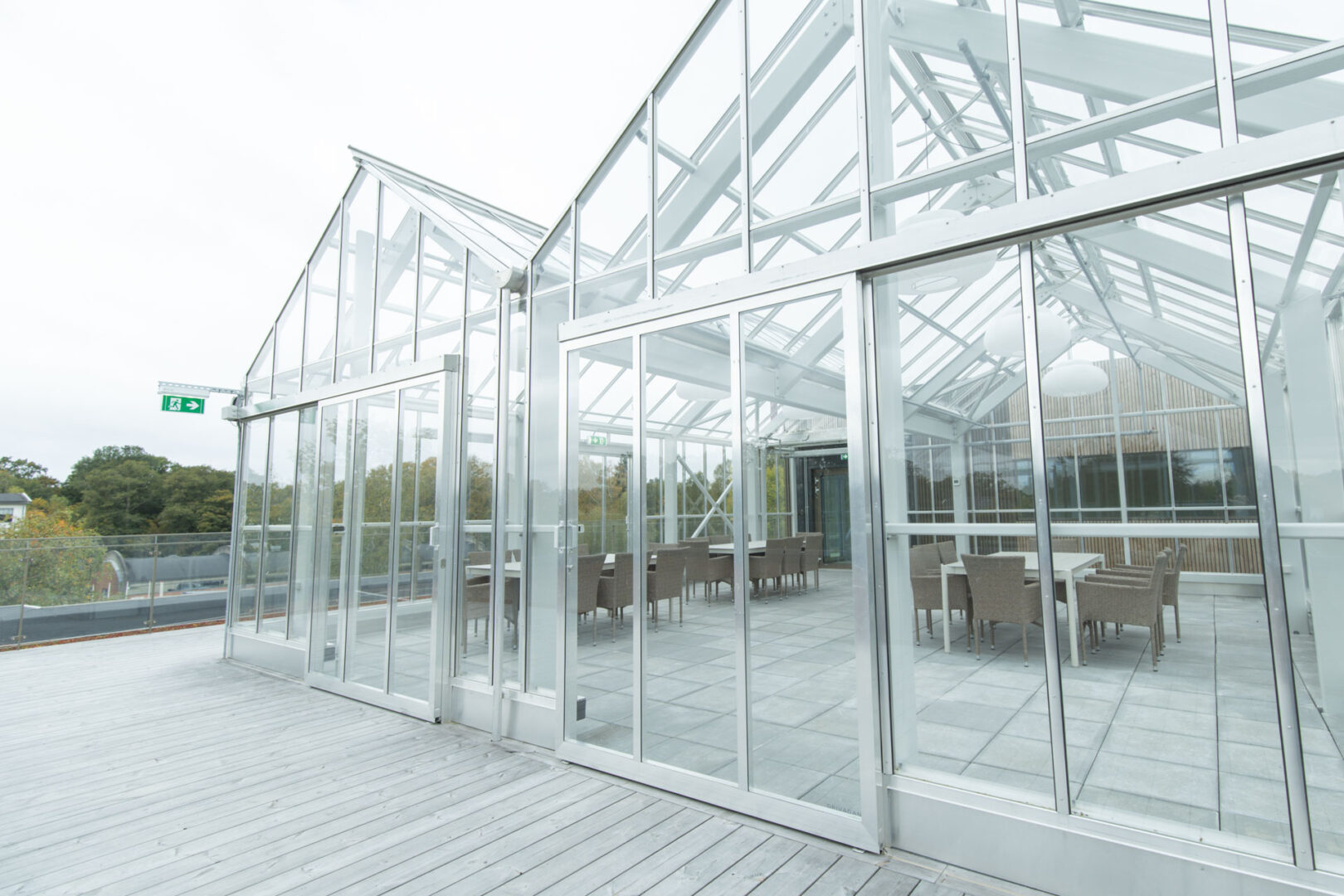 De 4 trappetårne på gavlene fremstår som lameller og bidrager til variation i facadeudtrykket. På taget af den vestlige boligfløj er der opført et orangeri – og på flere tagflader er der udført sedum og solceller.