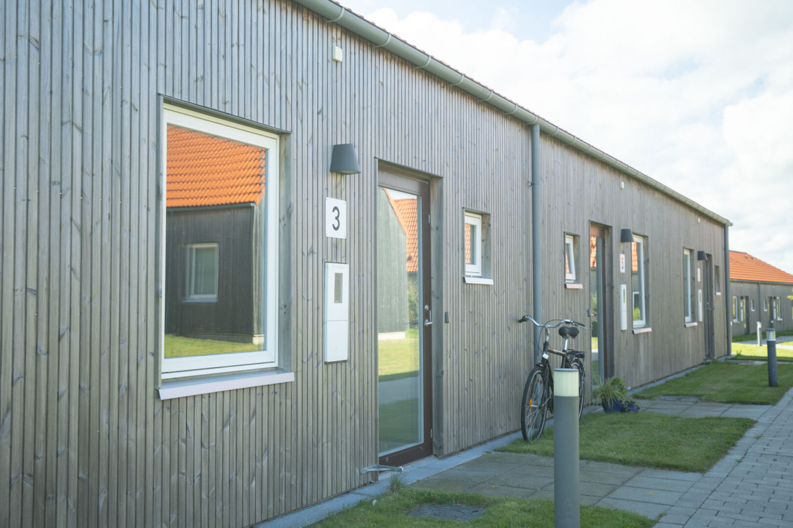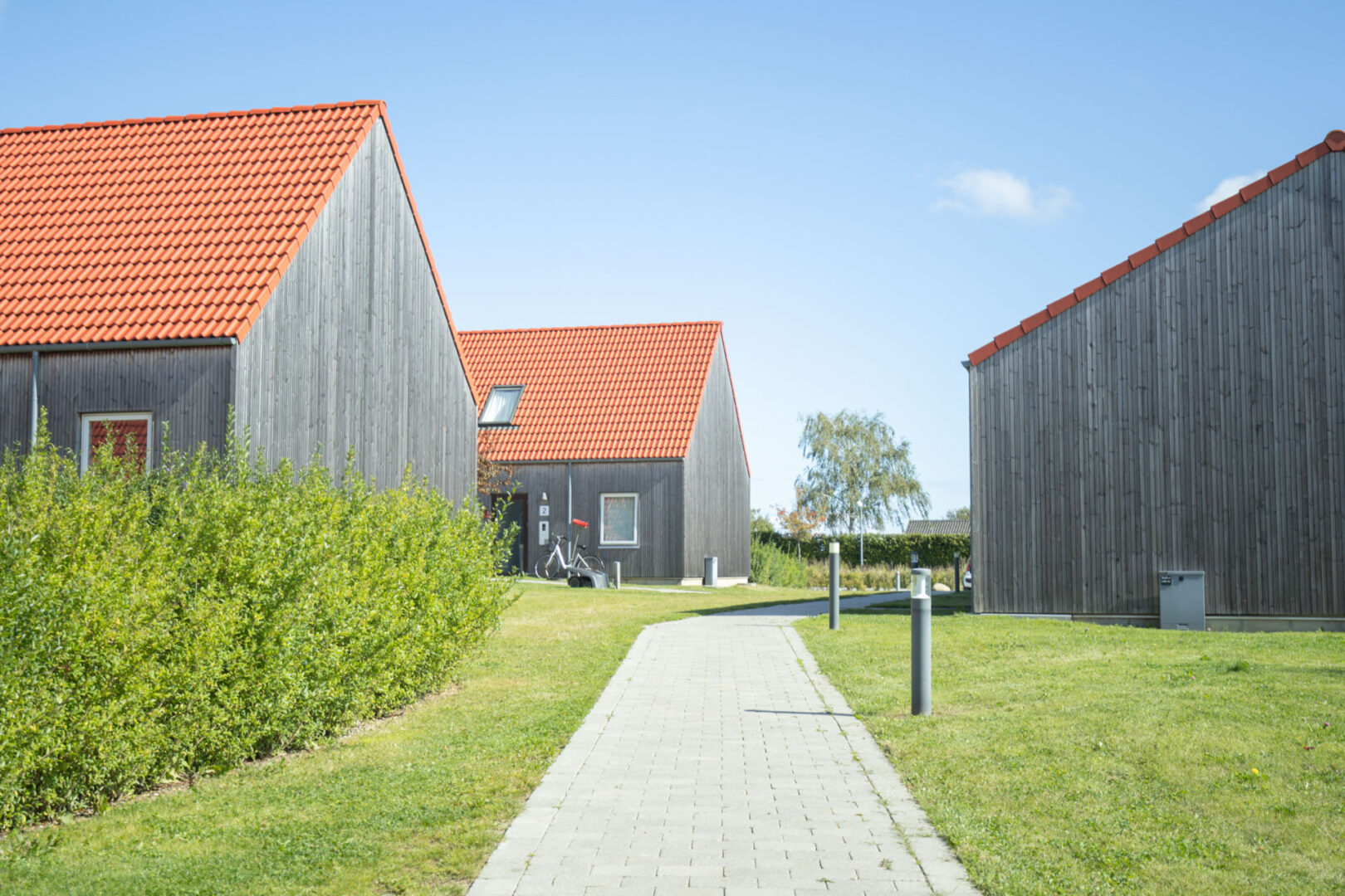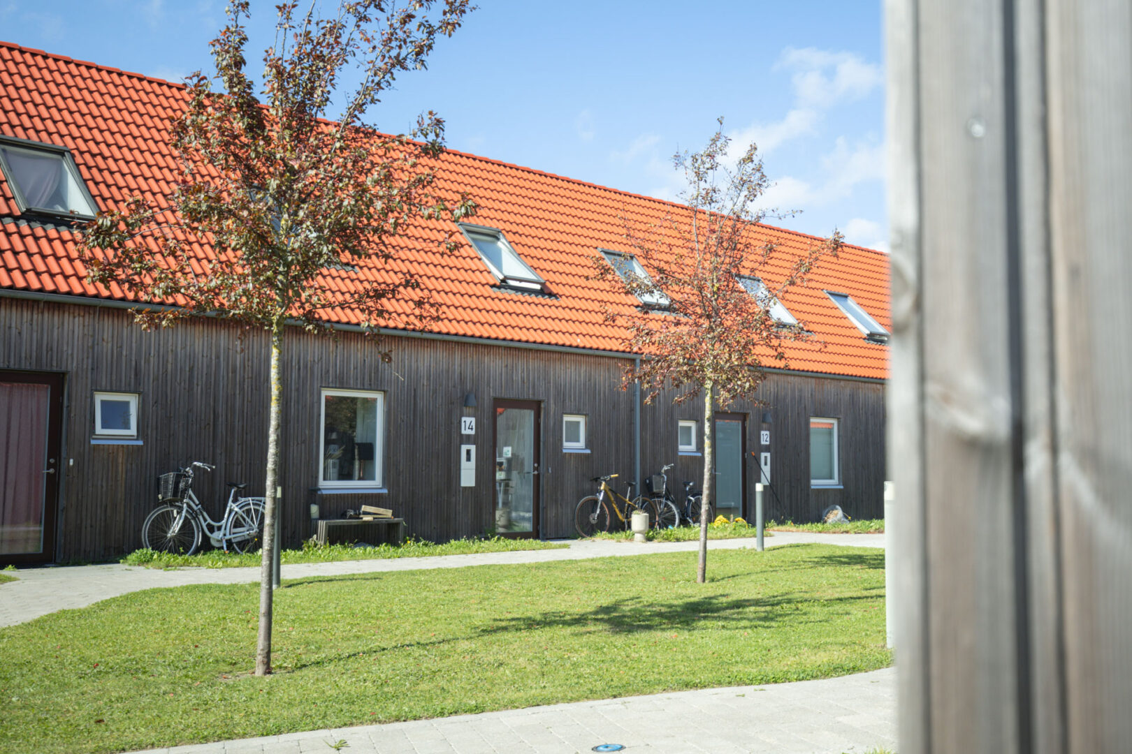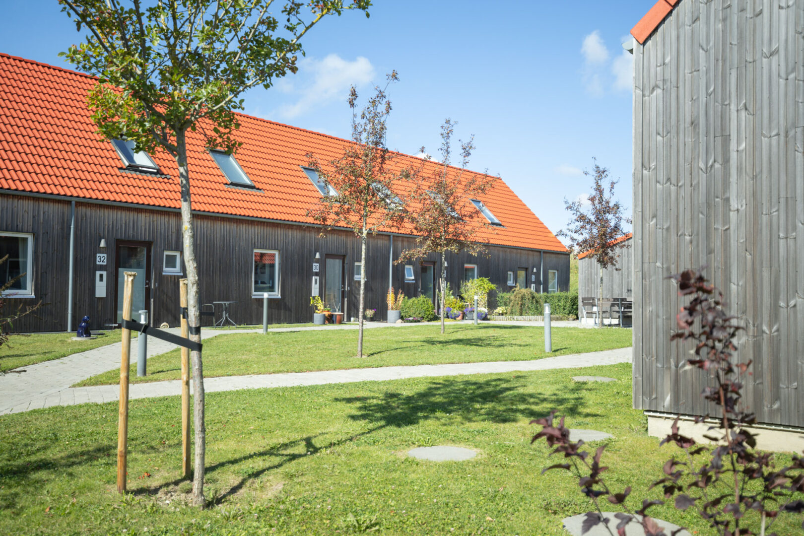 Bygningernes facade er beklædt med lodret, varmebehandlet træ og taget med røde betontagsten