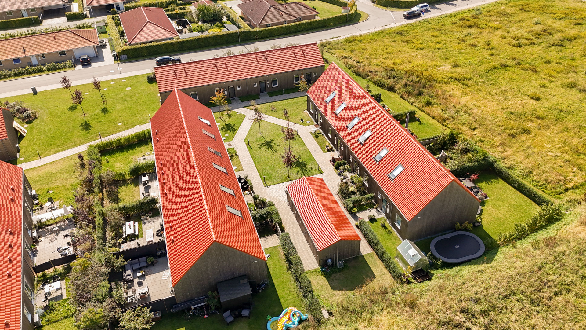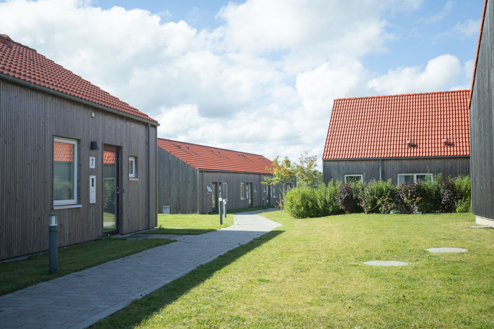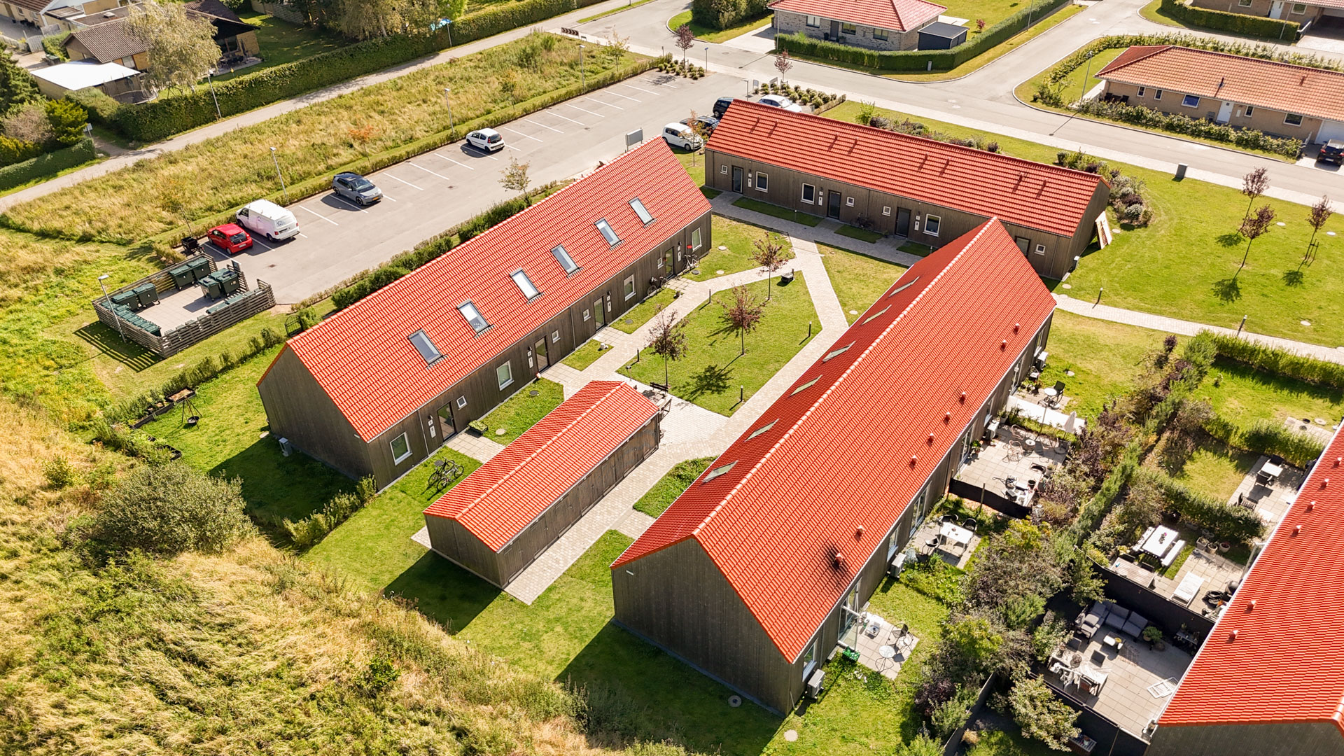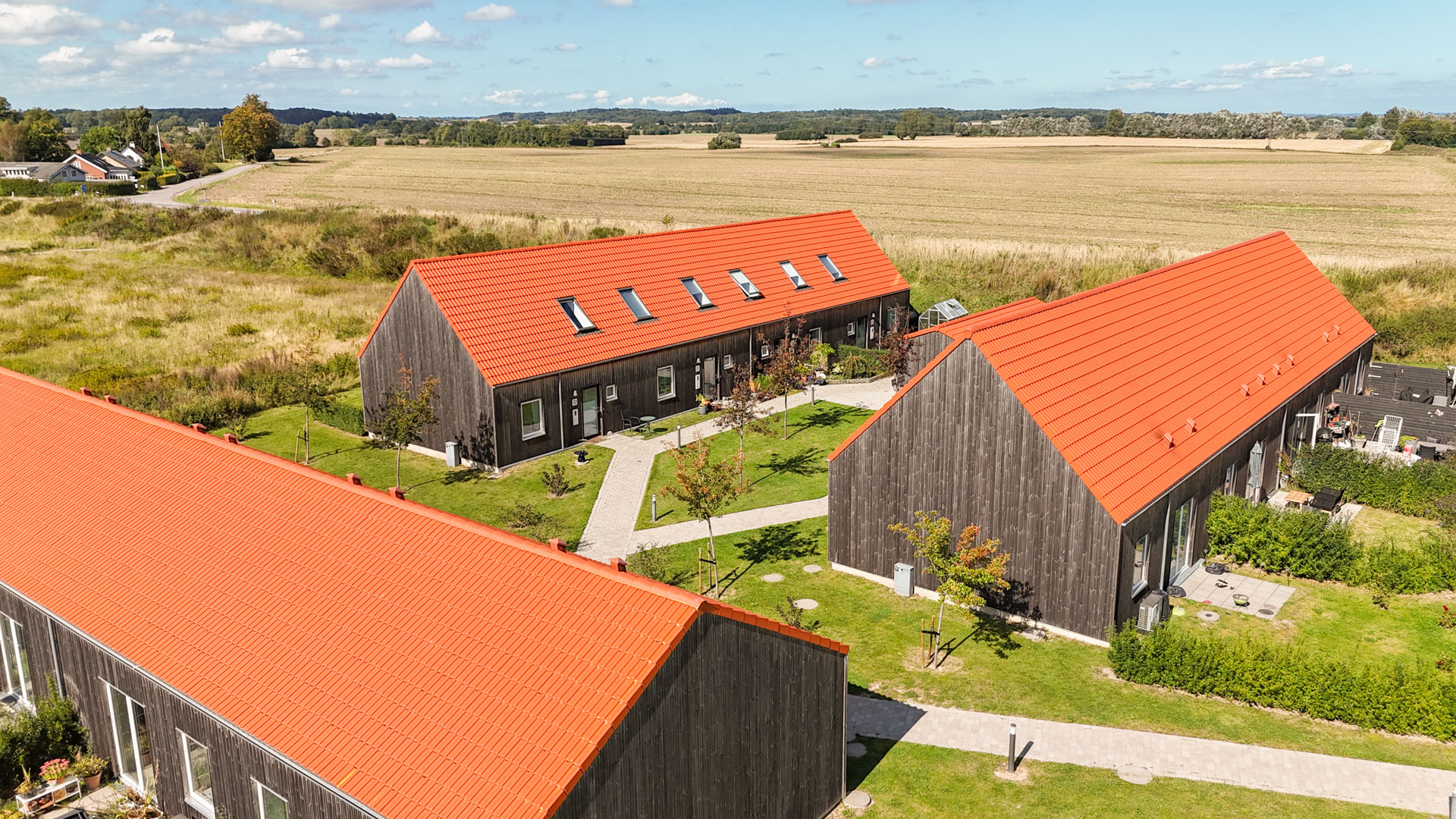 Bygningernes facade er beklædt med lodret, varmebehandlet træ og taget med røde betontagsten