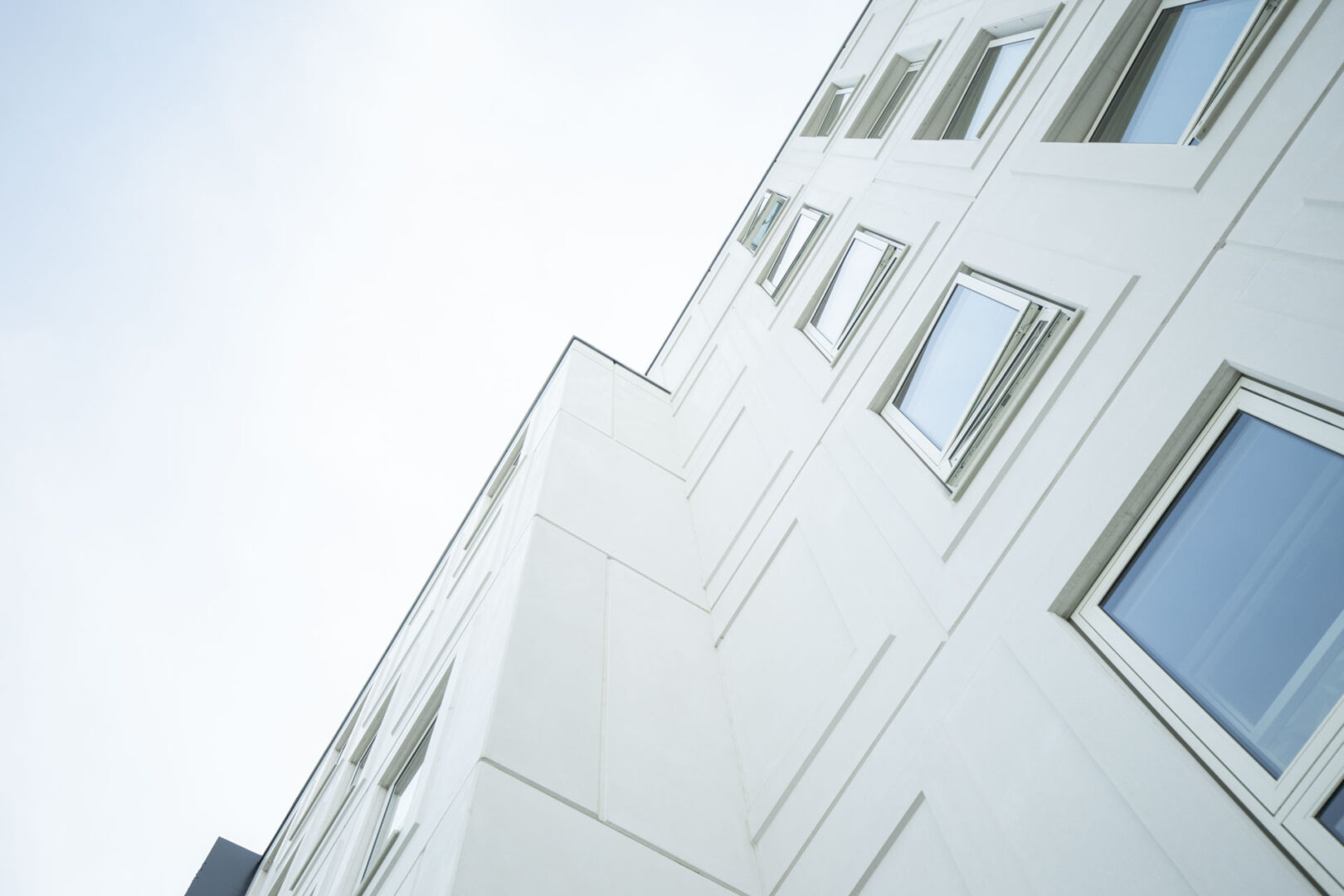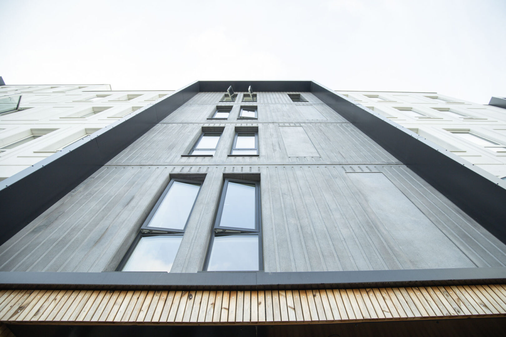 Bebyggelsen er på 5.500 m², samt fuld kælder på 950 m² – og ført op i 5 og 6 etager. Facader er udført i hvide beton-sandwichelementer med varierende ornamentering. Indgangspartier er i stueplan beklædt med mørkbejdset træ og øvrige etager er udført i indfarvet beton med relief i overfladen. Mod syd er udført altaner med ’grønne’ espalier-vægge.