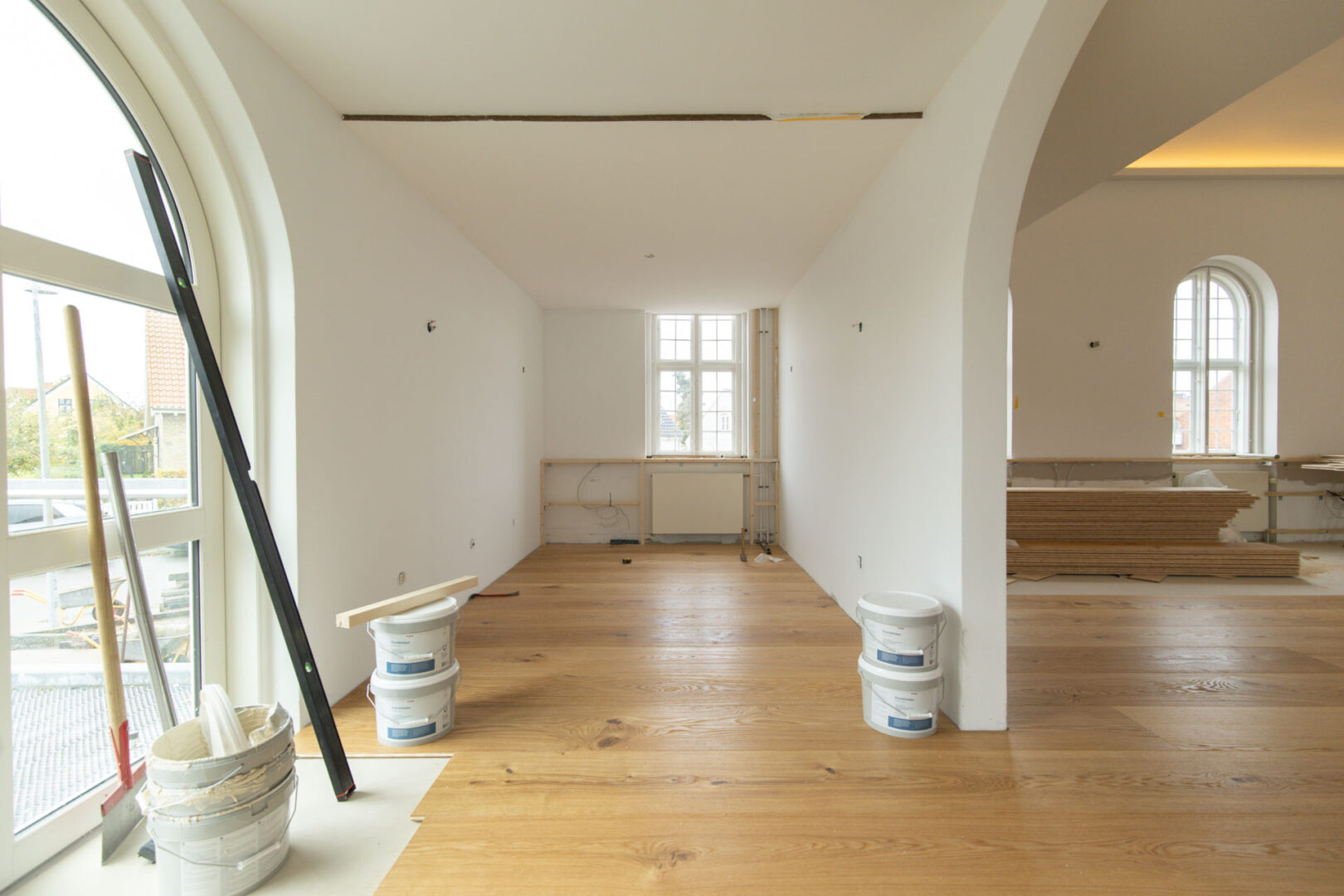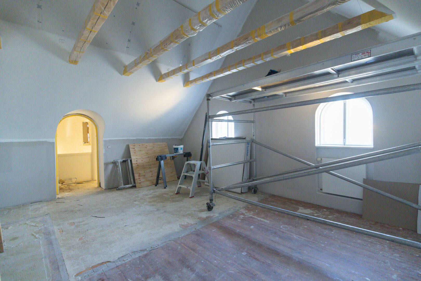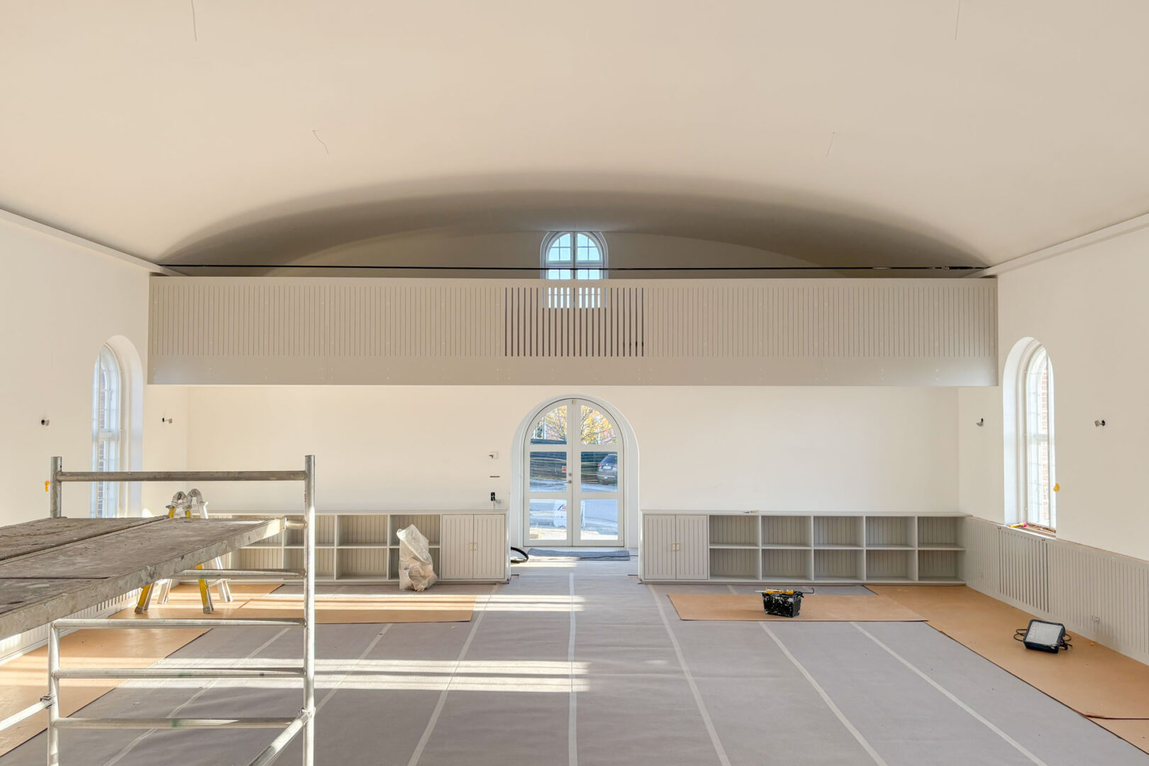 Vægge og hvælvinger er spartlet, malet og der udføres nye gulvbelægninger og belysning over alt i ejendommen. Langs væggene monteres profilerede træpaneler og der indbygges bænke og reoler i de nye kontorlokaler.