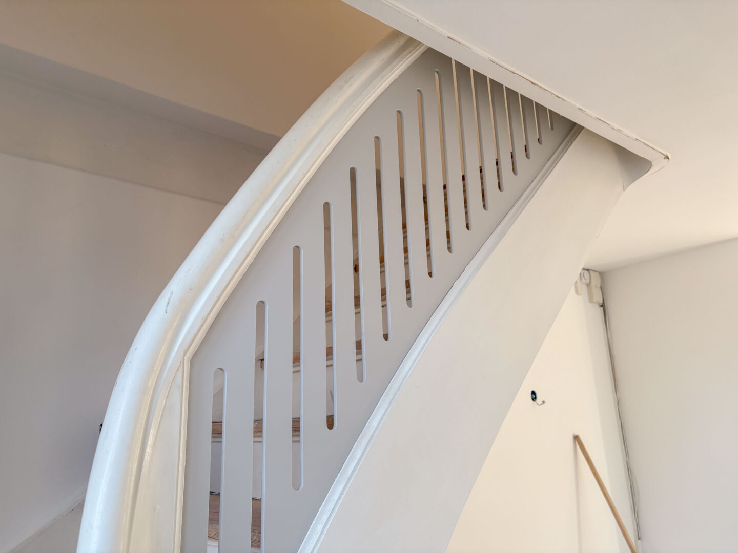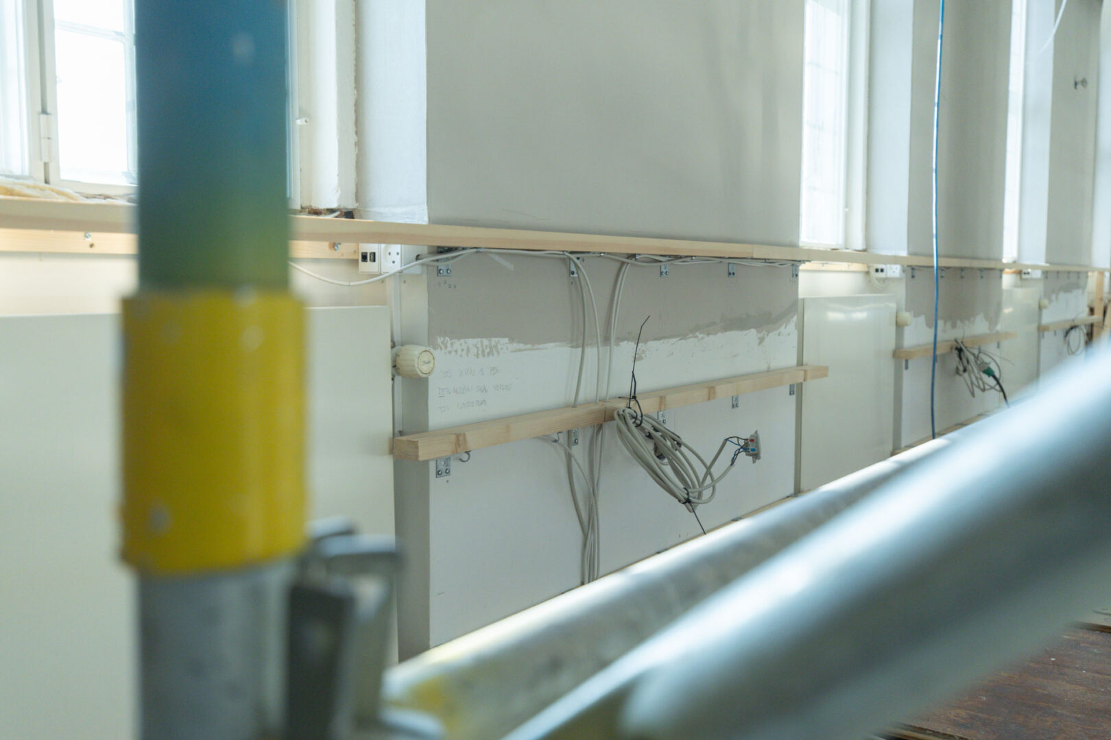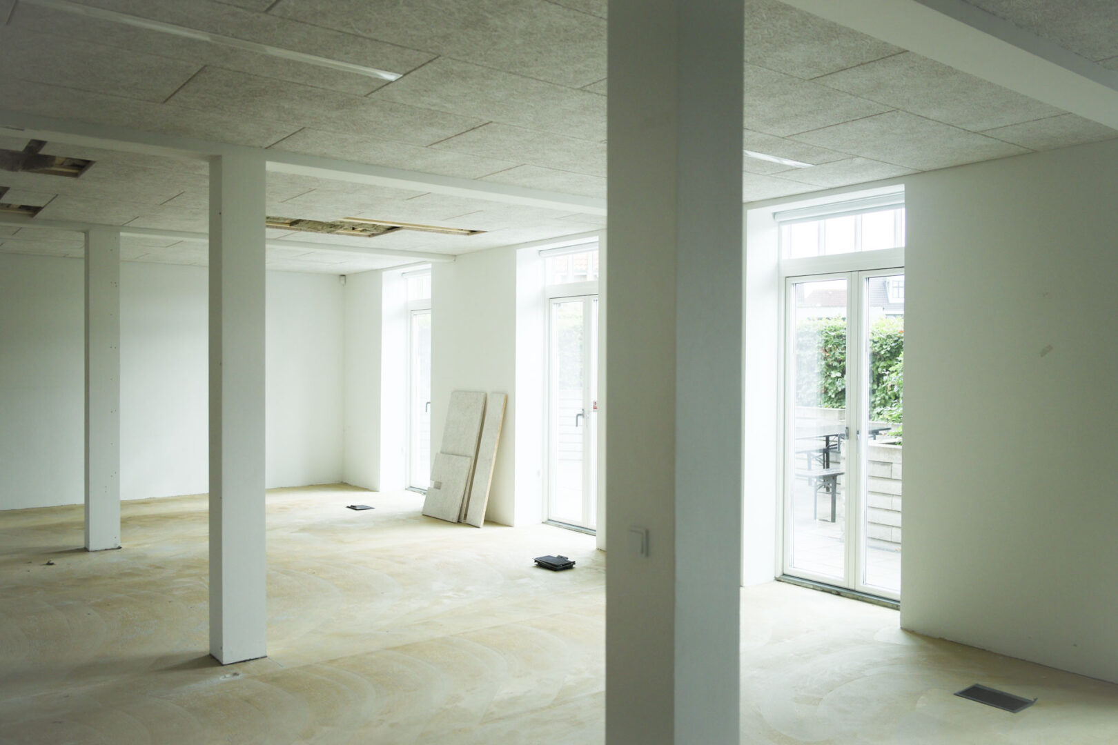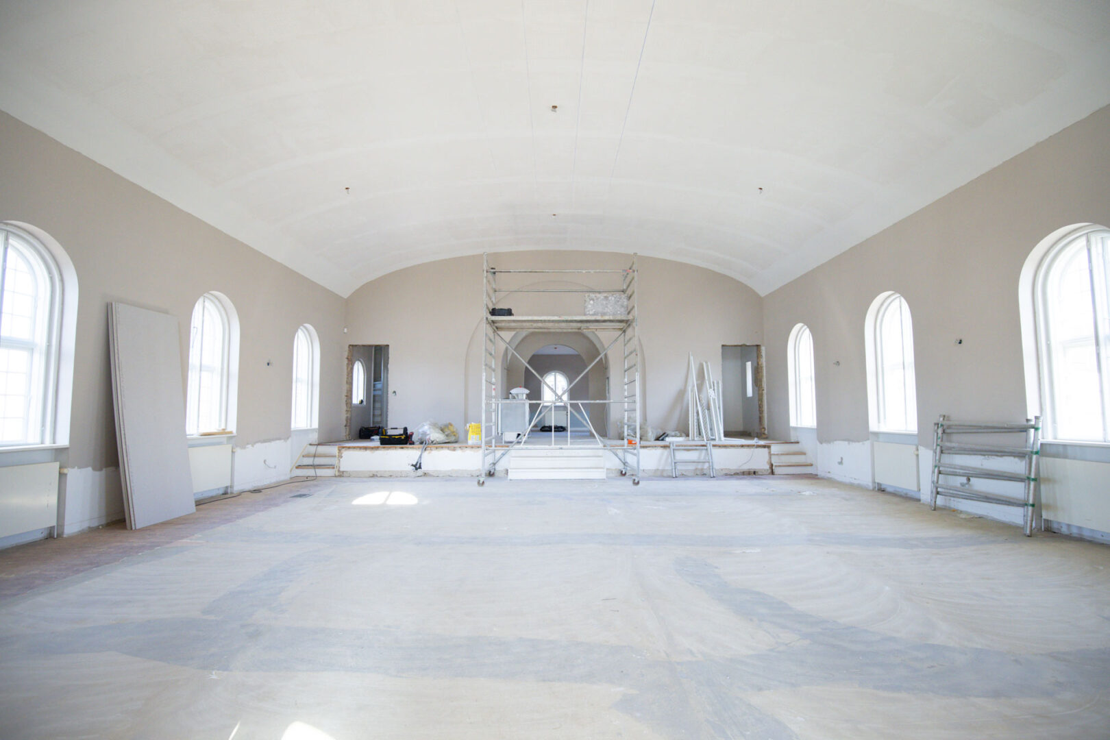 Vægge og hvælvinger er spartlet, malet og der udføres nye gulvbelægninger og belysning over alt i ejendommen. Langs væggene monteres profilerede træpaneler og der indbygges bænke og reoler i de nye kontorlokaler.