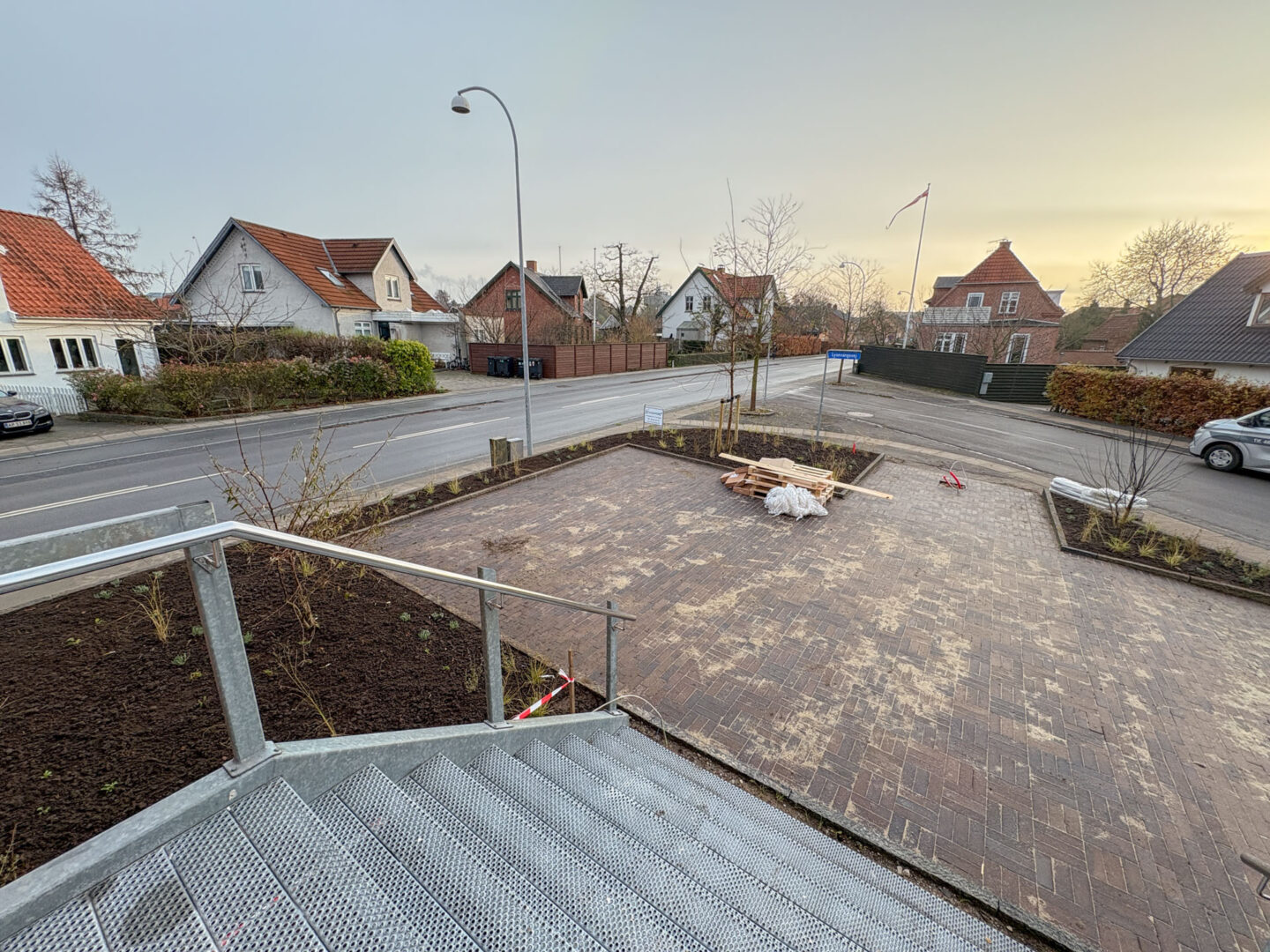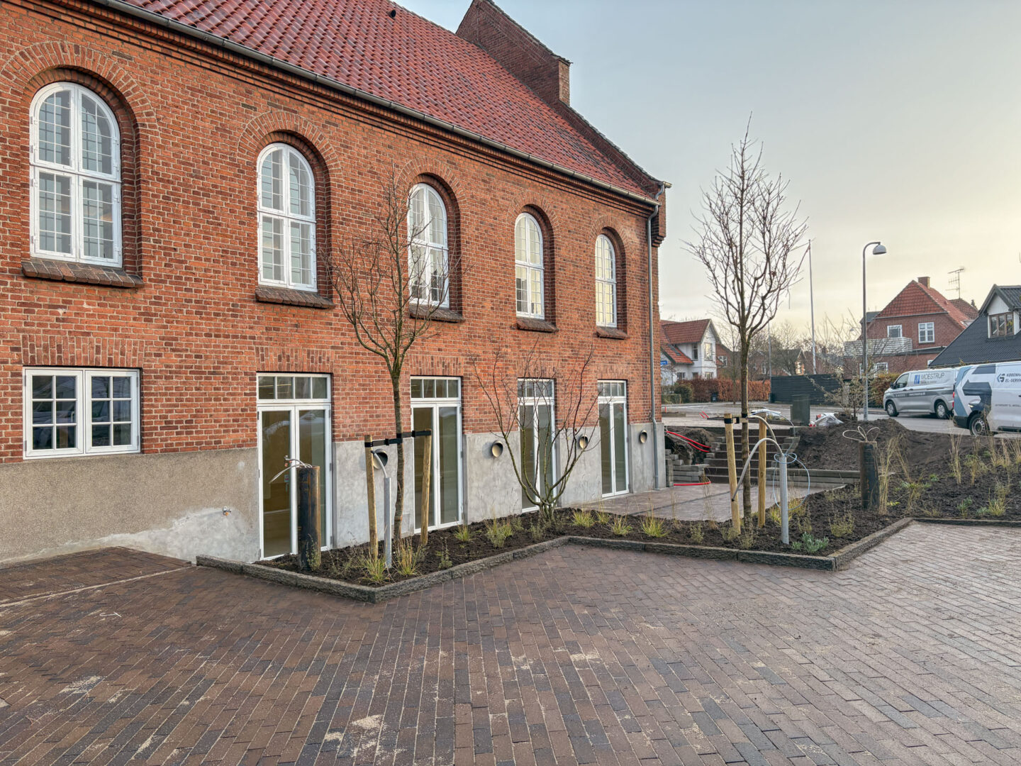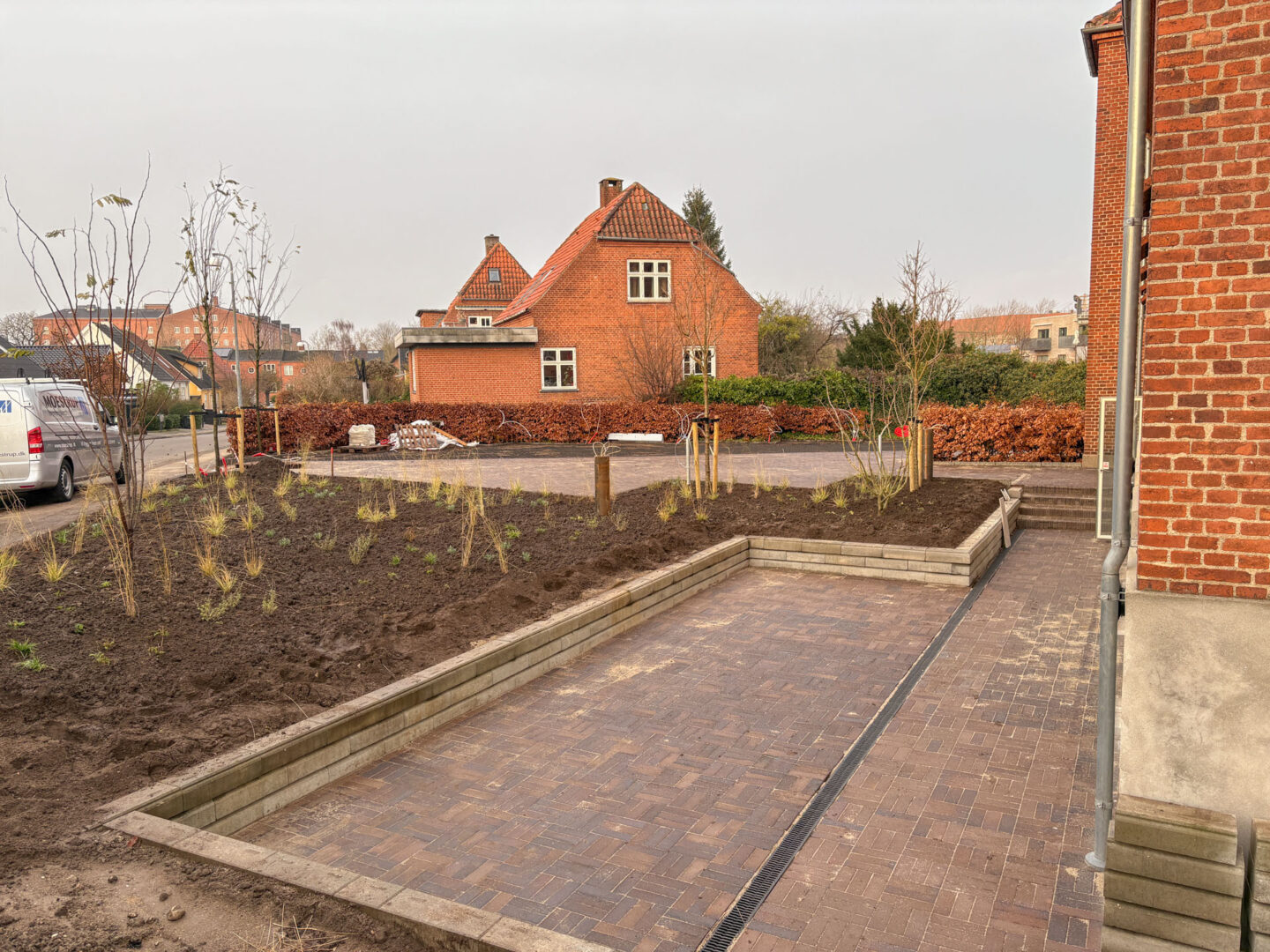 Udvendigt er der anlagt ny terrasse og belægning i parkeringsarealer – og der er udført ny beplantning og træer på grunden.