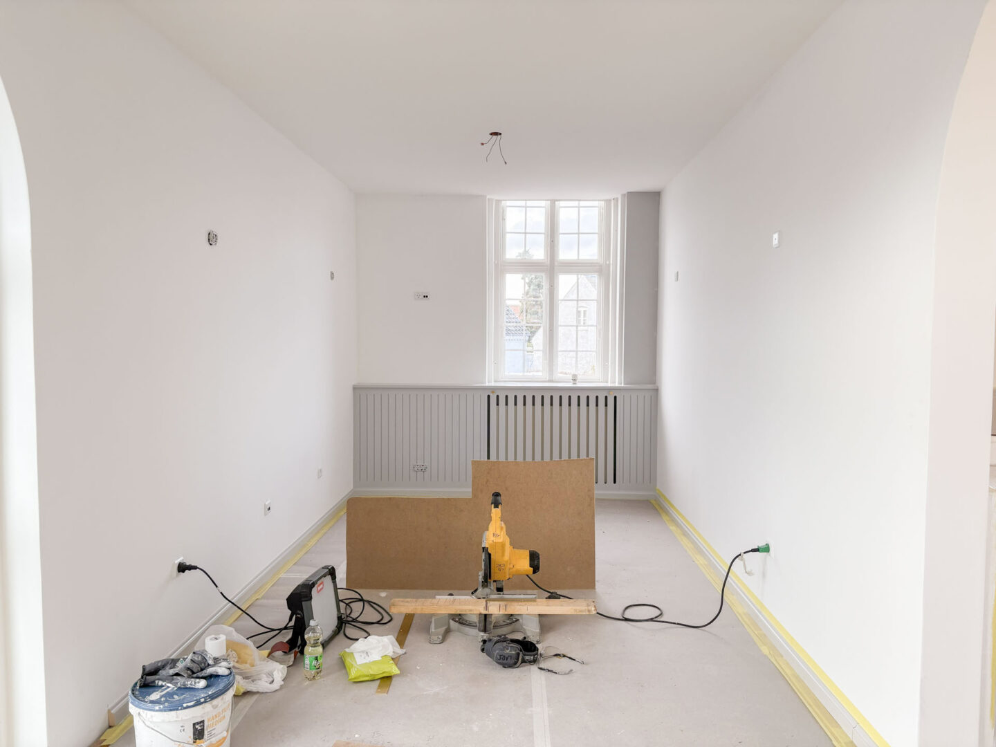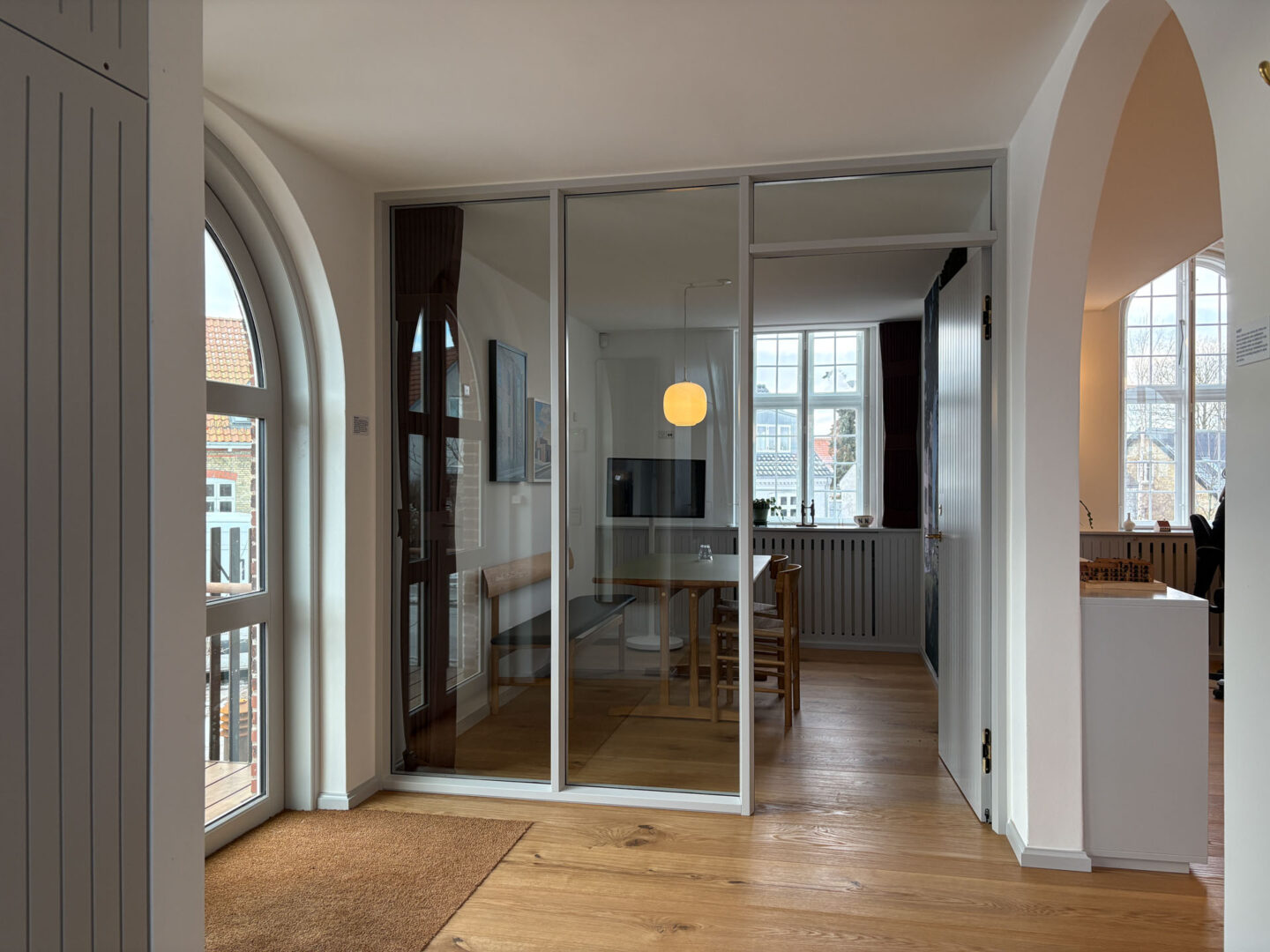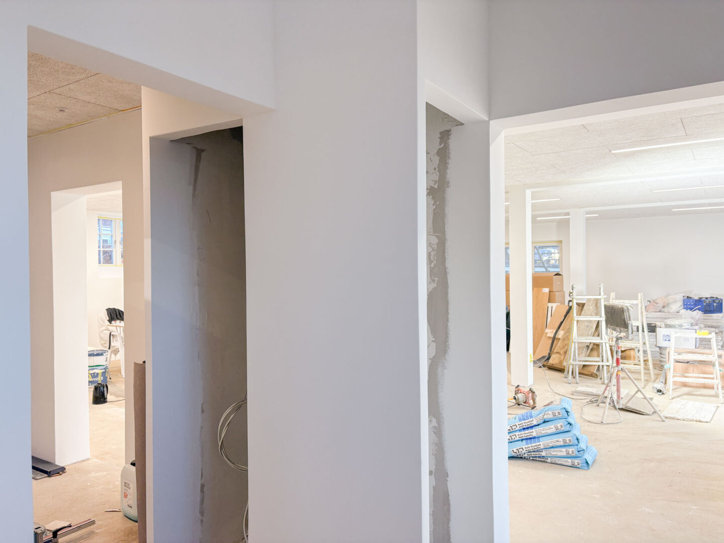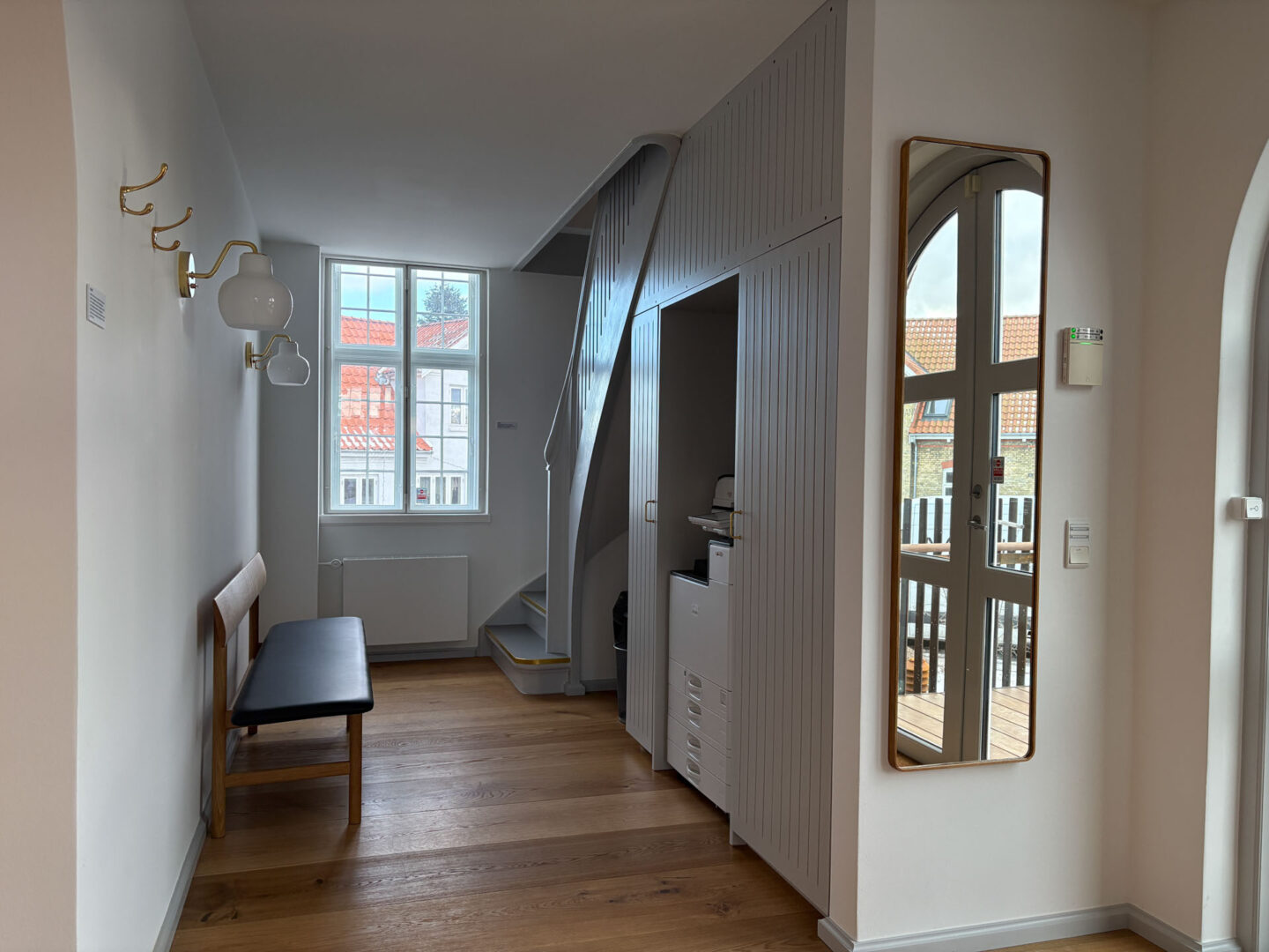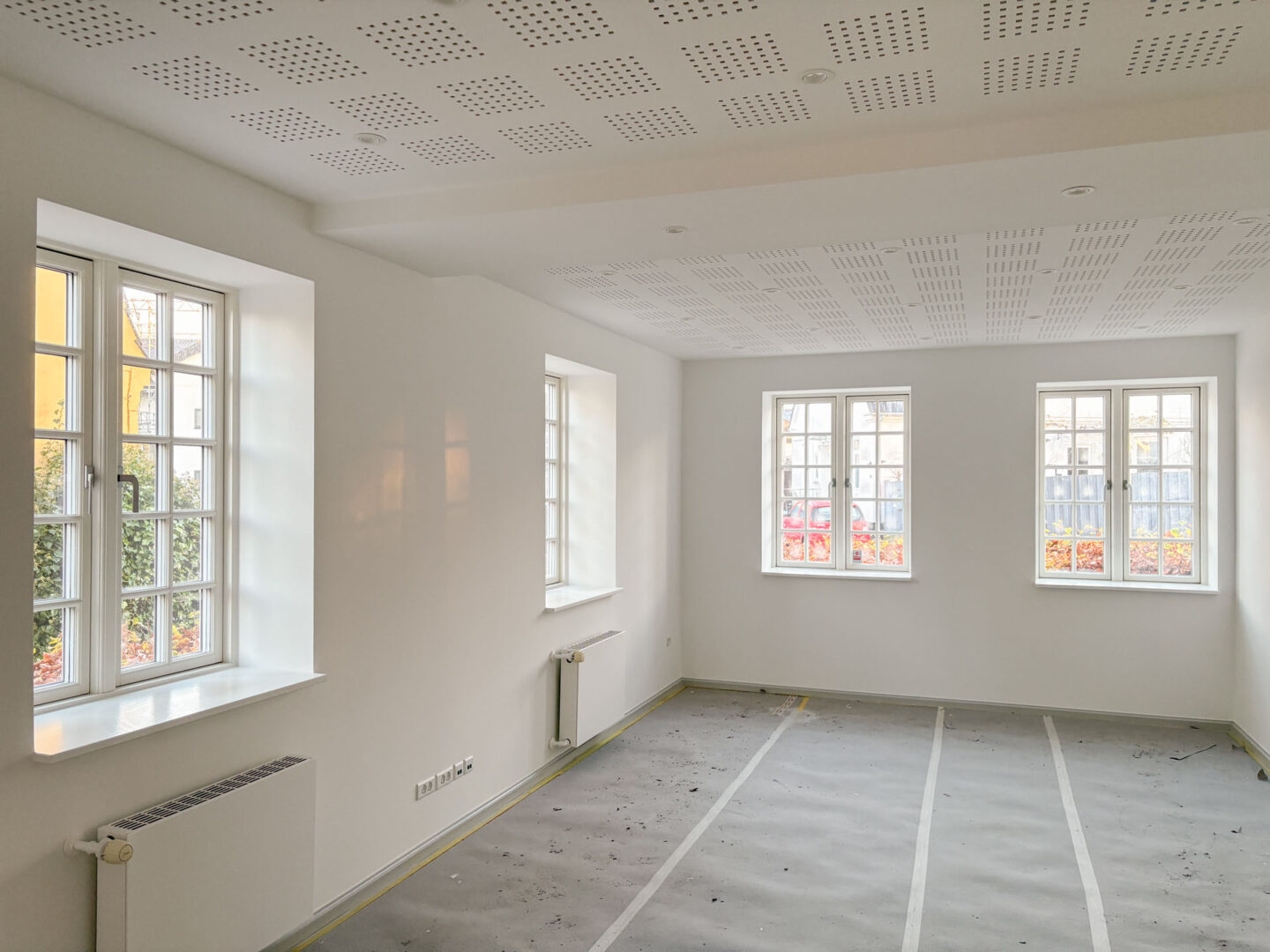 Vægge og hvælvinger er spartlet, malet og der er udført nye gulvbelægninger og belysning over alt i ejendommen. Langs væggene er der monteret profilerede træpaneler og der er indbygget bænke og reoler i de nye kontorlokaler.