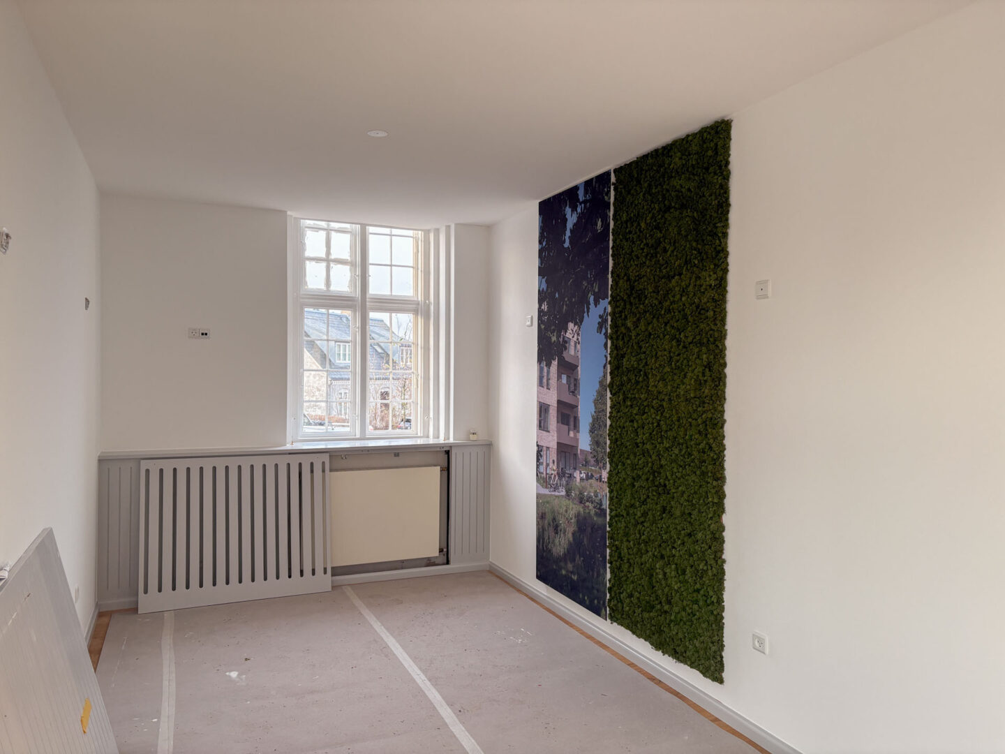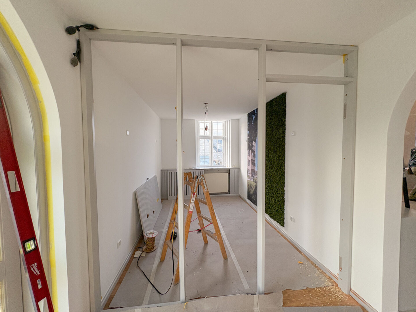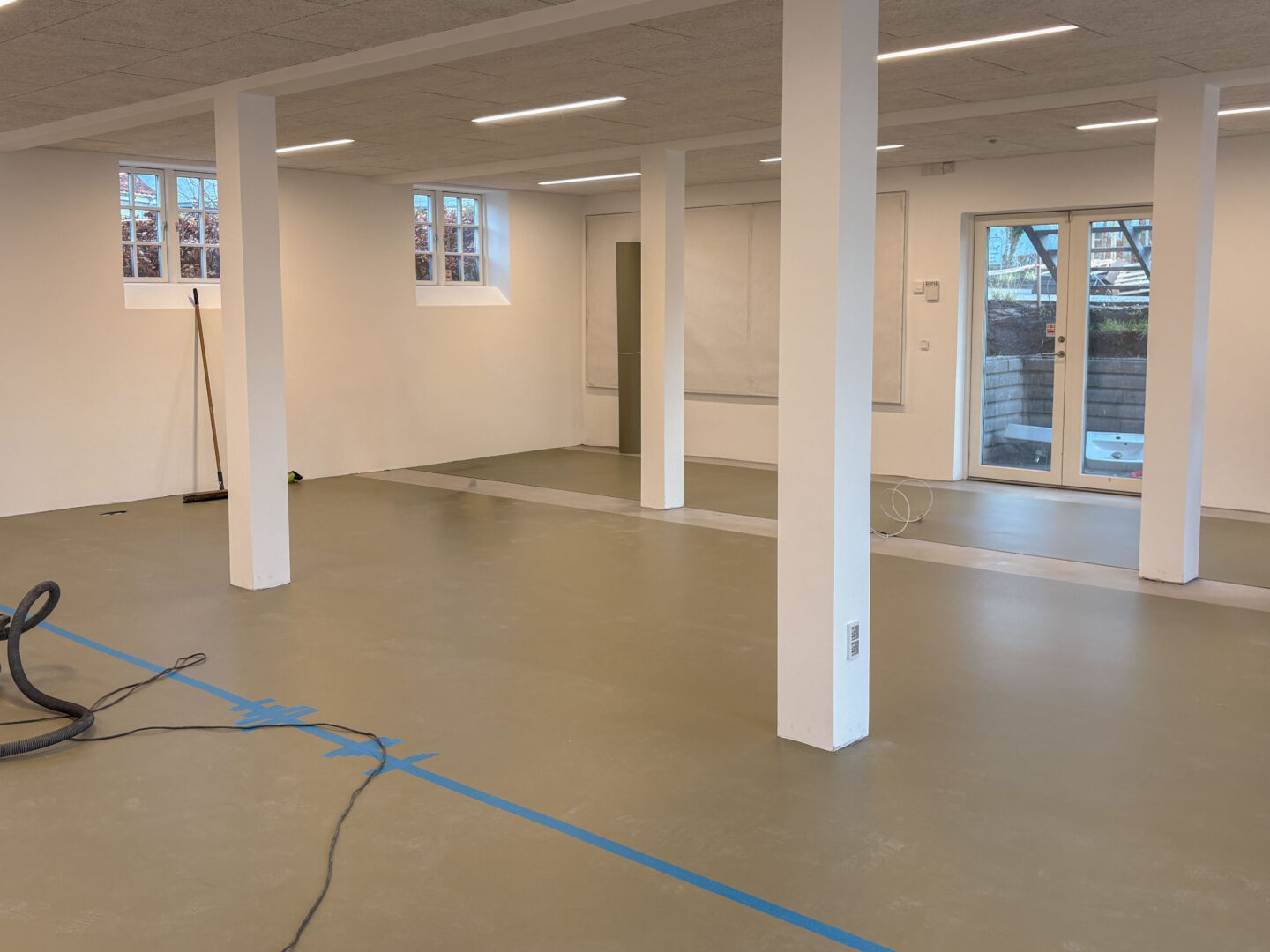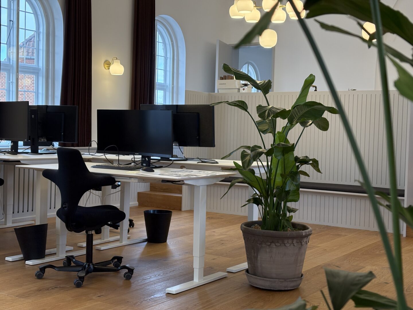 Vægge og hvælvinger er spartlet, malet og der er udført nye gulvbelægninger og belysning over alt i ejendommen. Langs væggene er der monteret profilerede træpaneler og der er indbygget bænke og reoler i de nye kontorlokaler.