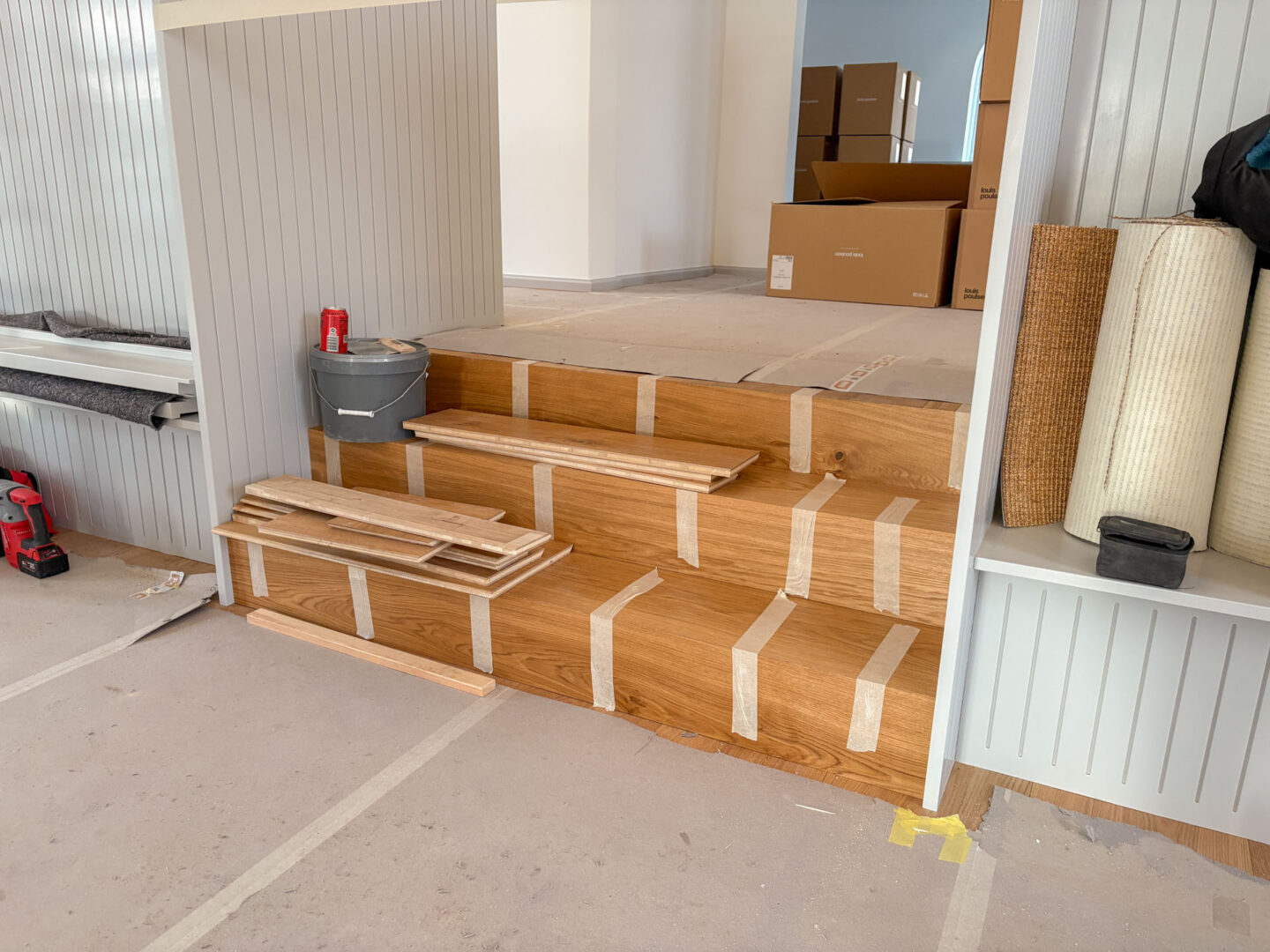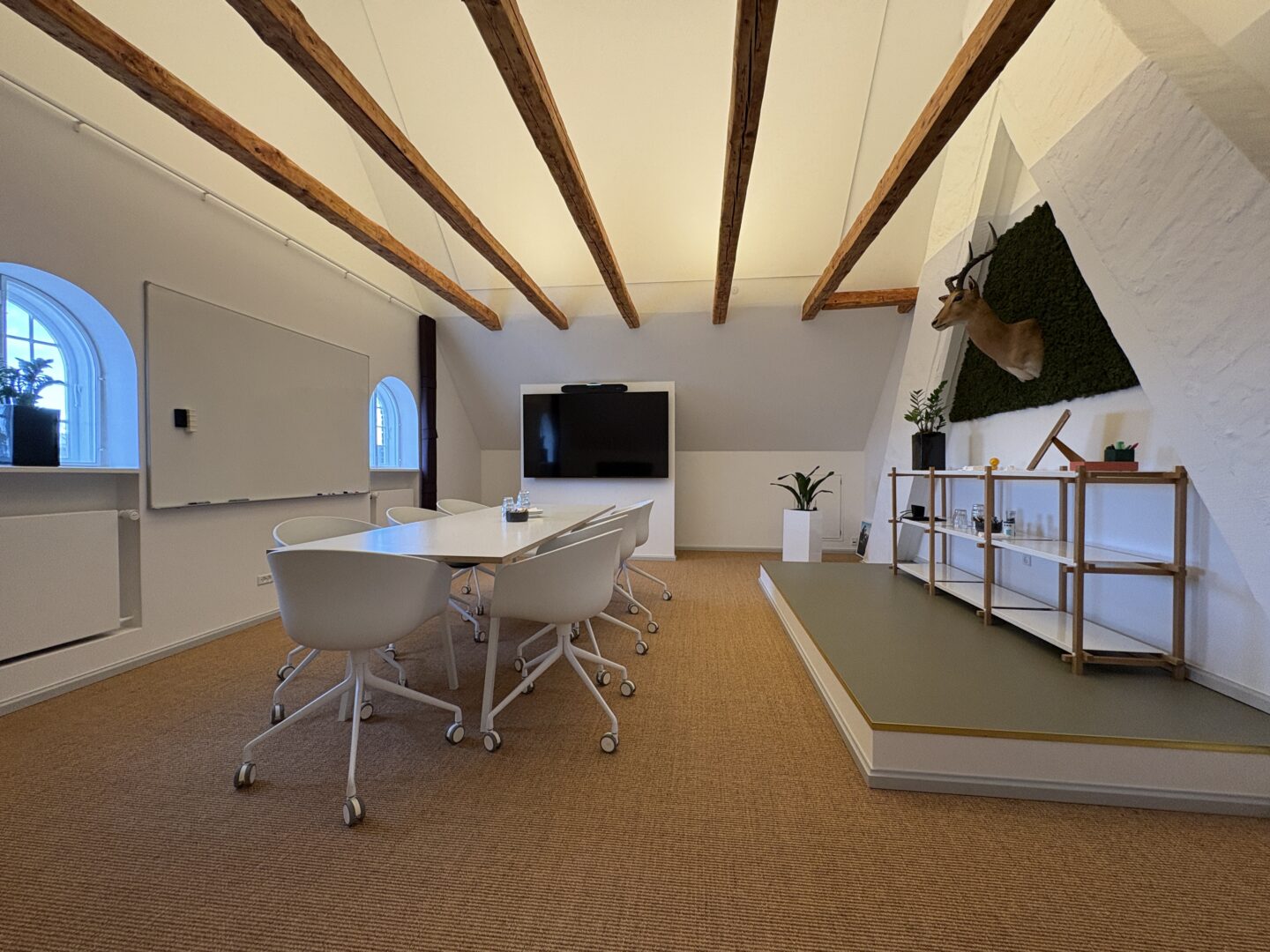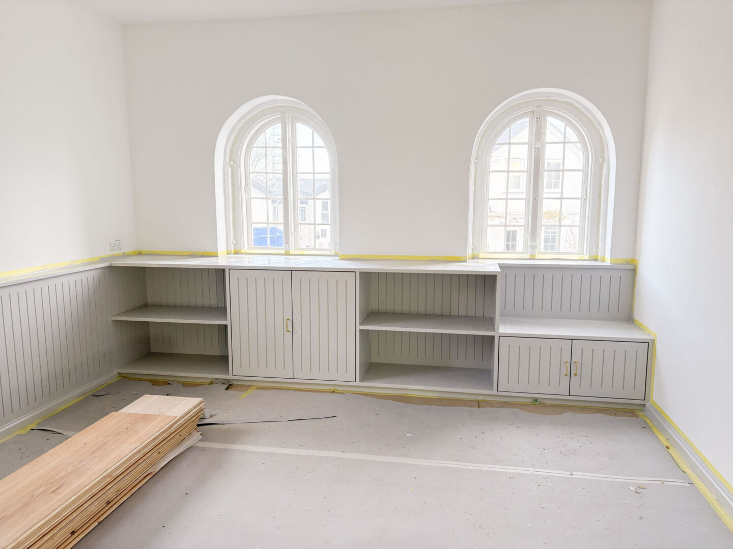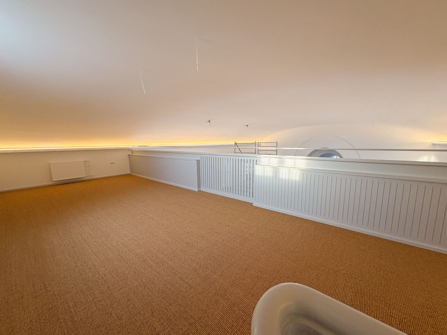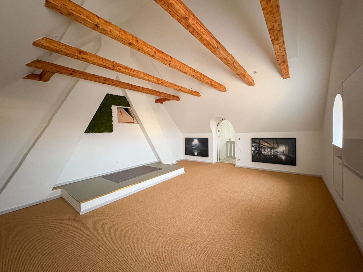 Vægge og hvælvinger er spartlet, malet og der er udført nye gulvbelægninger og belysning over alt i ejendommen. Langs væggene er der monteret profilerede træpaneler og der er indbygget bænke og reoler i de nye kontorlokaler.